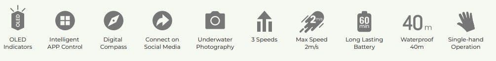 With speeds up to 2 m/s, a 40-meter waterproof rating, and 60 minutes of runtime, it's perfect for exploration or leisure. Recharge swiftly in just 2 hours and enjoy one-handed operation with accessory compatibility for capturing stunning underwater moments.